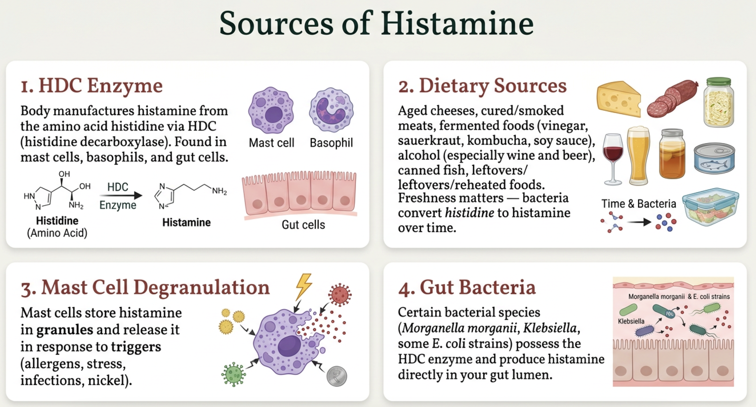 Your body has four sources of histamine. Your own cells manufacture it via an enzyme called histidine decarboxylase (HDC), primarily in mast cells, basophils, and gut lining cells [3]. Your food contributes histamine when it's aged, fermented, or improperly stored — bacteria convert the amino acid histidine into histamine over time, which is why freshness matters so much. Your mast cells store histamine in granules and release it when triggered by allergens, stress, infections, or nickel [12]. And certain gut bacteria — species like Morganella morganii and Klebsiella — possess the HDC enzyme and produce histamine directly in your gut lumen [3, 5].