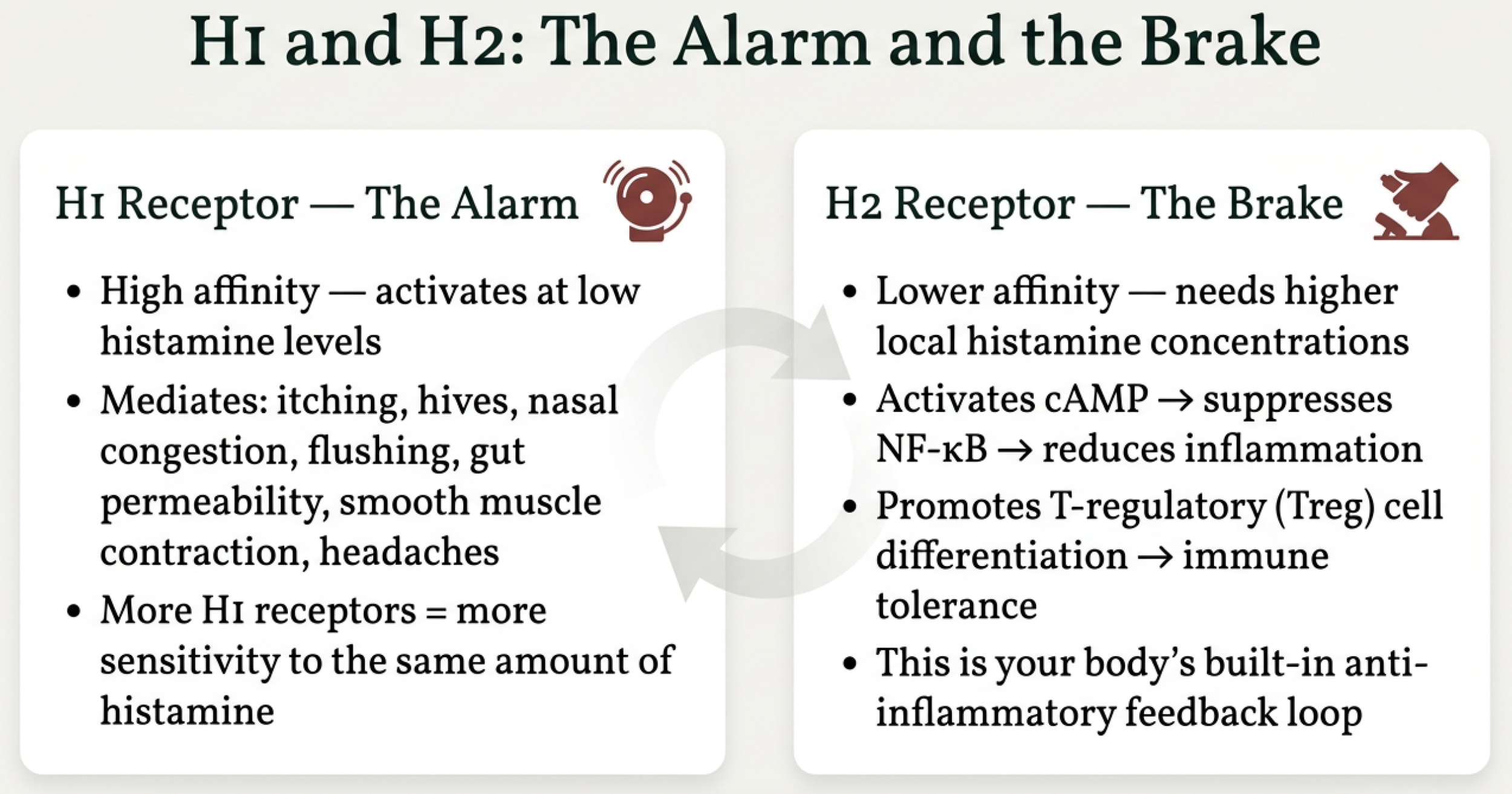 Two receptors matter most. The H1 receptor is the alarm — it's high-affinity, meaning it activates at low histamine levels, and it mediates the symptoms most people associate with histamine reactions: itching, hives, flushing, nasal congestion, headaches, and increased gut permeability [2]. The critical concept here is that the number of H1 receptors on your cells determines your sensitivity. More receptors means more reactivity to the same amount of histamine.