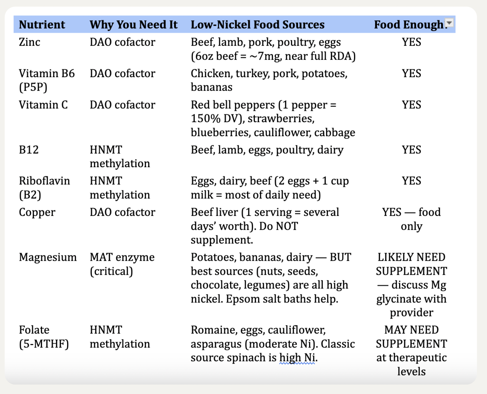 Step 2 — Restore (rebuild the enzymes, after removing the trigger): For DAO: zinc, B6 as P5P, vitamin C from low-nickel sources like red bell peppers and blueberries. For MAT/HNMT: magnesium, methylcobalamin B12, 5-MTHF folate, riboflavin. TMG (betaine) to help clear SAH and prevent HNMT inhibition. Prioritize food sources first; supplement the genuine gaps (magnesium, possibly folate) with your provider's guidance.