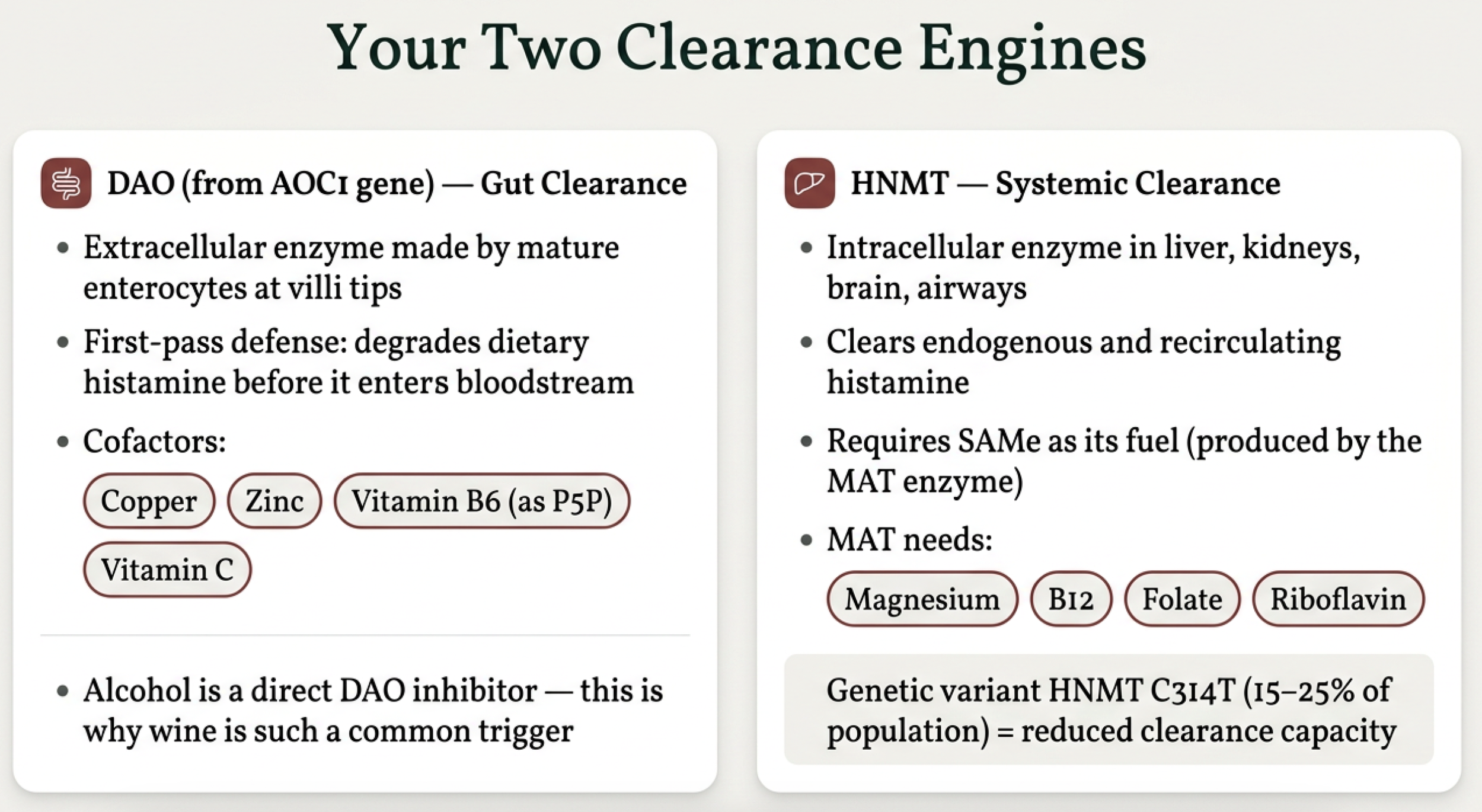 DAO (diamine oxidase, encoded by the AOC1 gene) is your gut clearance enzyme. It's produced by enterocytes in the intestinal villi, and it stays local — degrading dietary histamine in the gut lumen before it can enter the bloodstream [3, 5]. DAO never reaches systemic circulation in meaningful quantities. It needs copper, zinc, vitamin B6 (as P5P), and vitamin C as cofactors, and alcohol is a direct competitive inhibitor [3].
