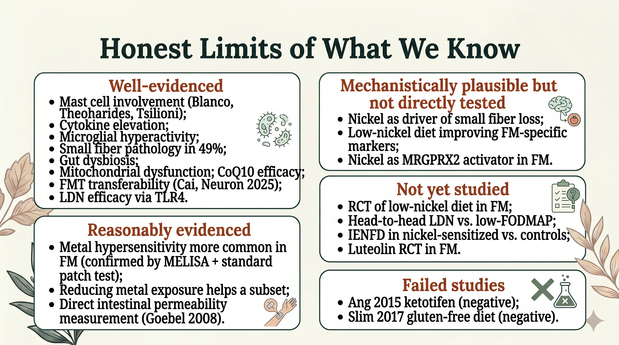 Not yet tested: RCT of low-nickel diet in FM. Head-to-head low-nickel vs. low-FODMAP. Nickel-specific small fiber or mast cell quantification.