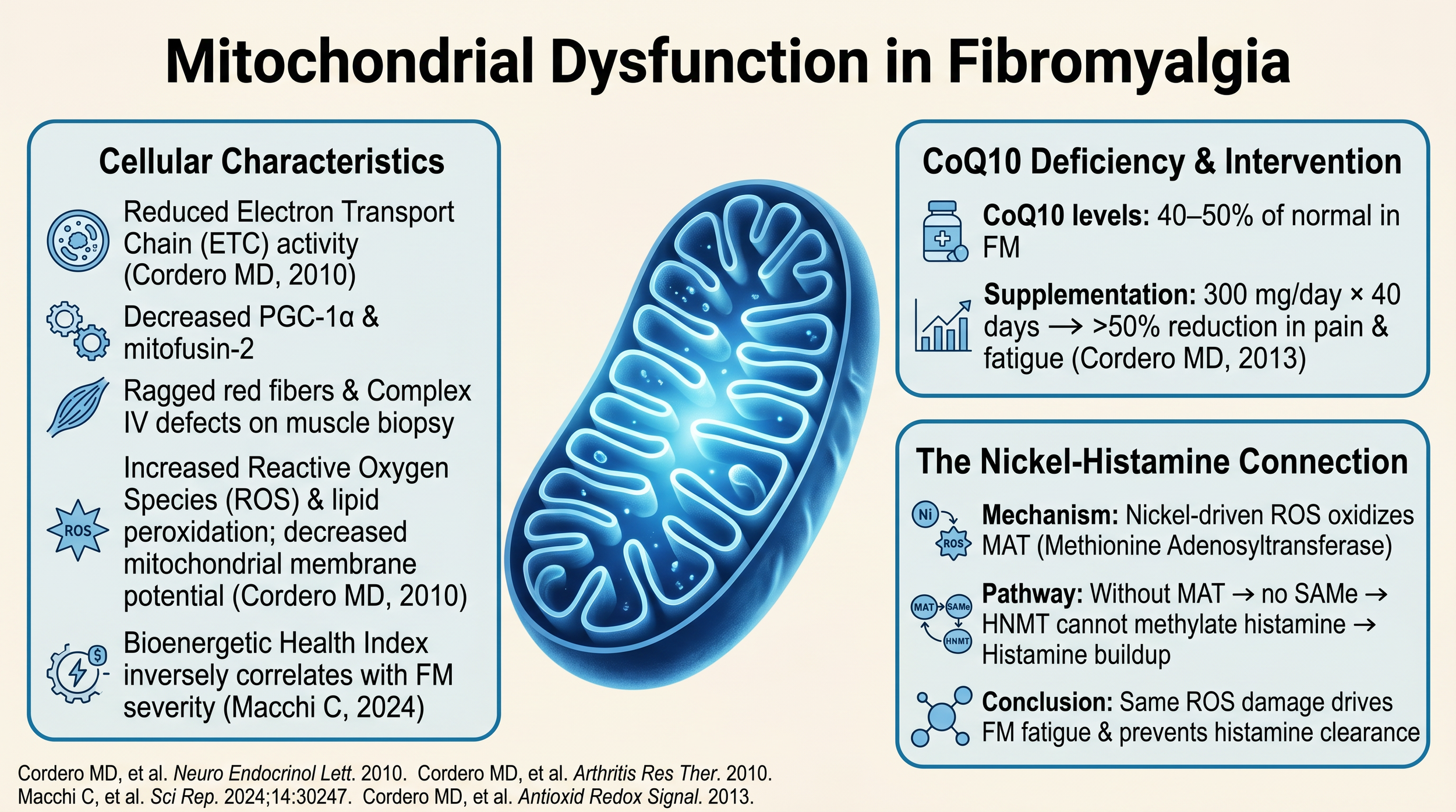 Fibromyalgia patients show reduced electron transport chain activity, ragged red fibers on muscle biopsy, increased reactive oxygen species, and CoQ10 levels at 40-50% of normal (Cordero 2010). The Bioenergetic Health Index inversely correlates with FM severity (Macchi 2024).