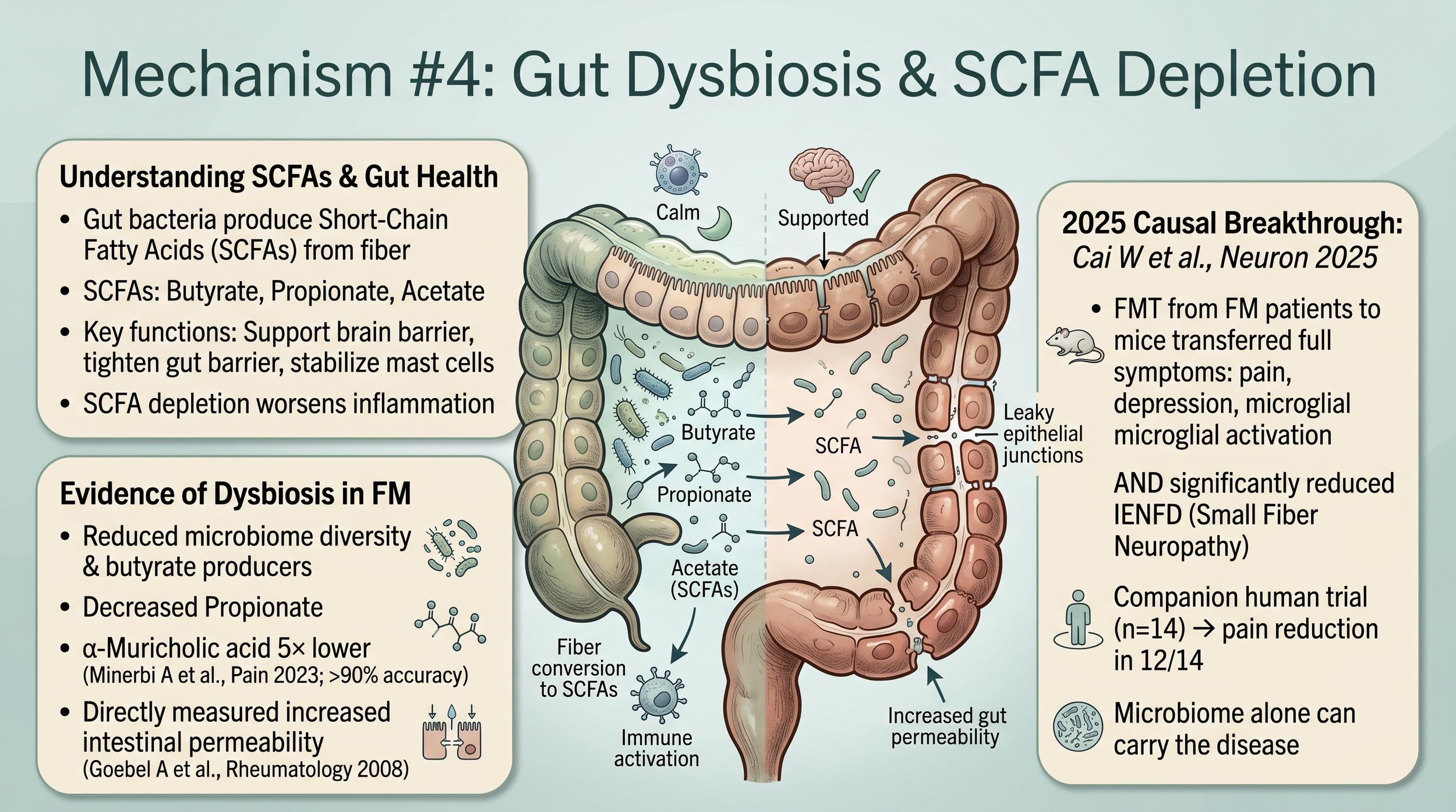 Fibromyalgia patients show reduced microbiome diversity, depleted propionate, and directly measured increased intestinal permeability (Goebel 2008). In 2025, Cai et al. published a landmark paper in Neuron (2025;113:2161-2175): fecal microbiota transplant from FM patients into germ-free mice transferred pain hypersensitivity, depression, microglial activation, altered metabolism, and reduced nerve fiber density. A companion human trial (n=14) showed pain reduction in 12 of 14 women.