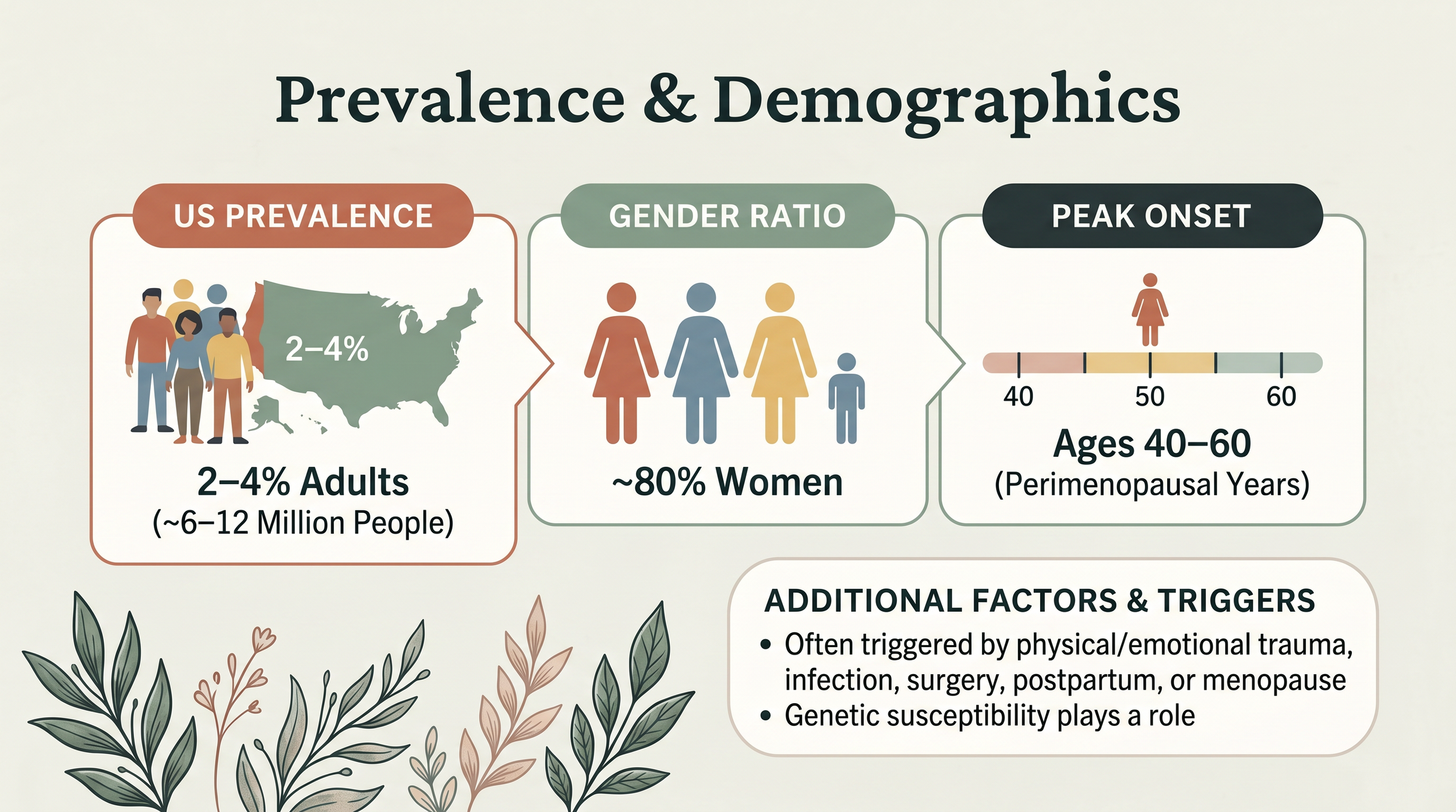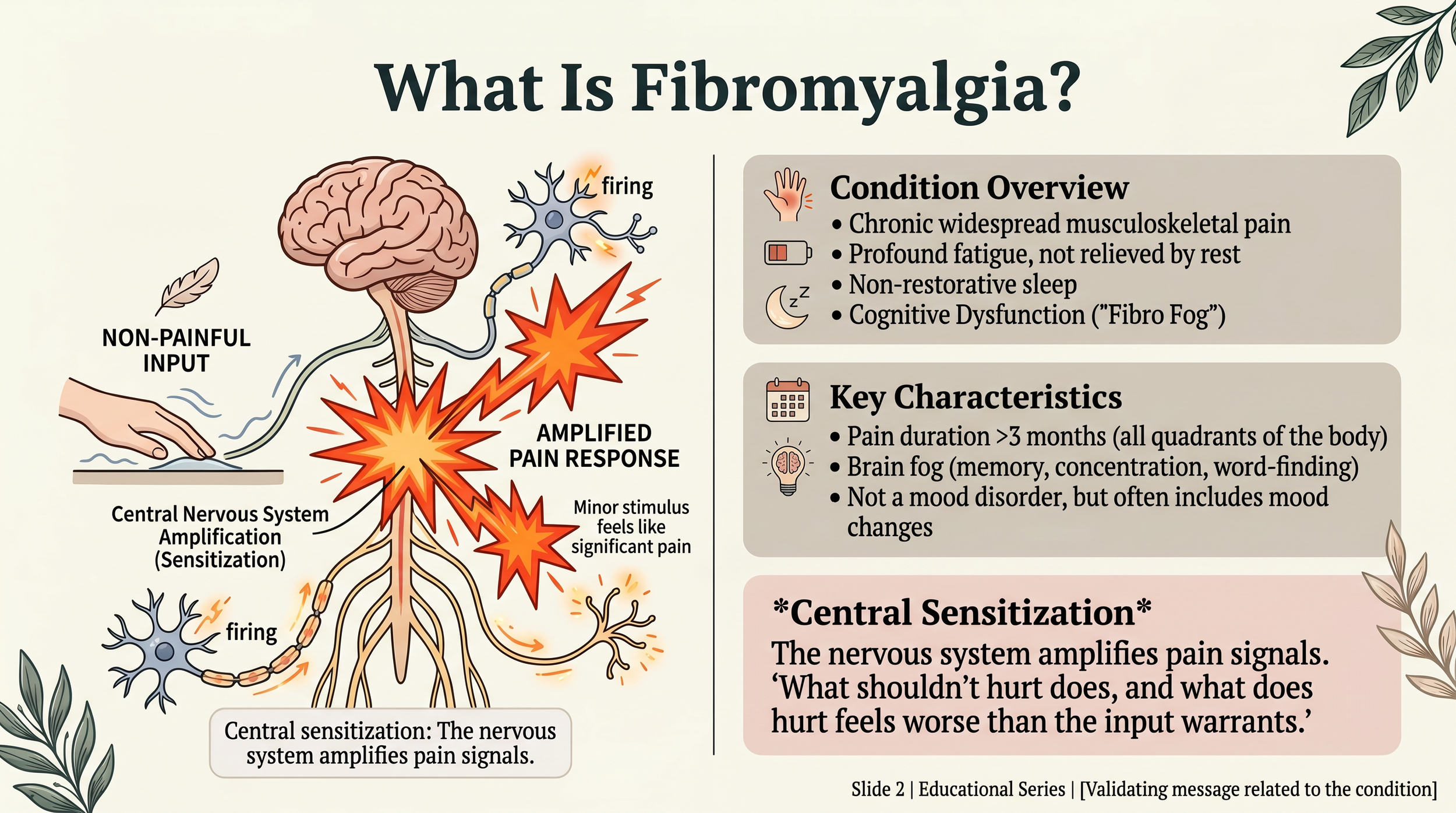 Fibromyalgia is chronic widespread musculoskeletal pain lasting more than three months, accompanied by fatigue, cognitive dysfunction (“fibro fog”), and unrestorative sleep. It affects 2-4% of US adults — roughly 6 to 12 million people — and approximately 80% are women, with peak onset between ages 40 and 60.