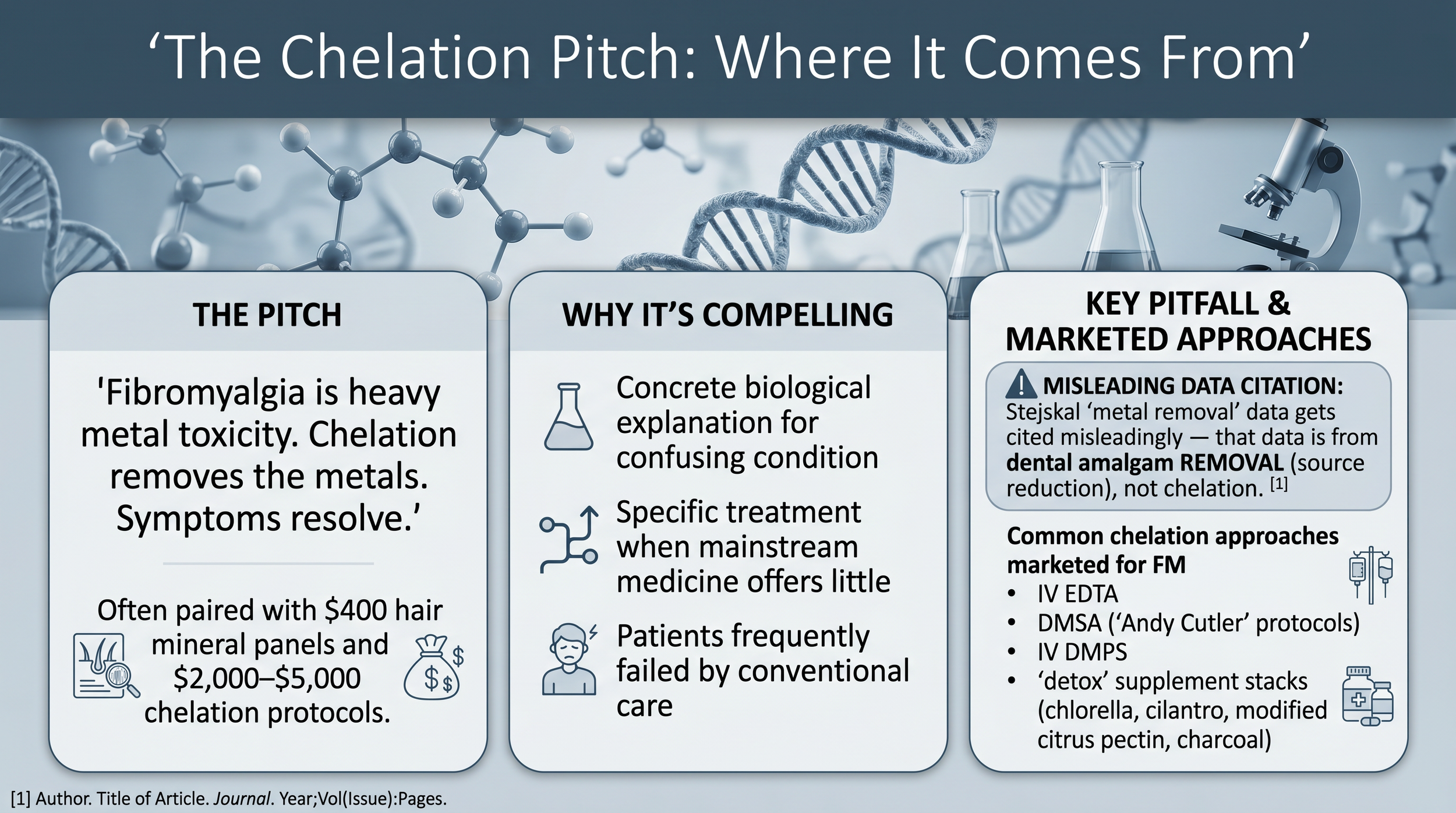 If you have searched for metals and fibromyalgia online, you have likely seen chelation marketed as the solution. The pitch is compelling — it frames a confusing, dismissed condition as a concrete biological problem with a specific, actionable treatment.