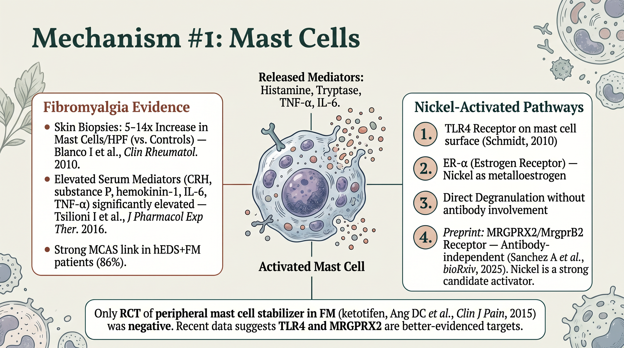 Nickel activates mast cells through three simultaneous pathways — TLR4 receptor (Schmidt 2010), estrogen receptor alpha (metalloestrogen activity), and direct degranulation. A 2025 preprint adds a fourth potential pathway via MRGPRX2 (Sanchez A et al., bioRxiv. 2025 — not yet peer-reviewed).