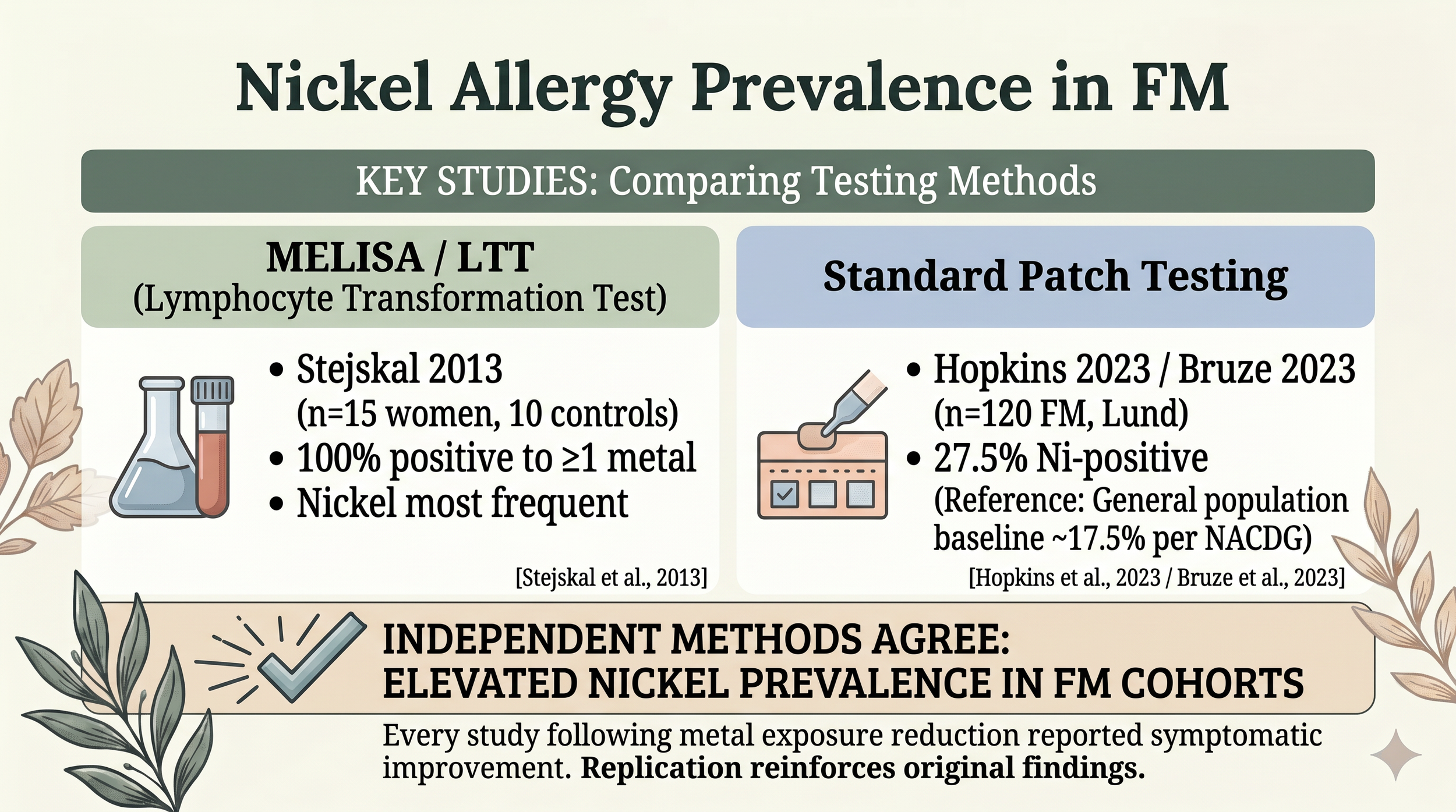 Multiple studies have examined nickel allergy prevalence in fibromyalgia patients. The general population baseline for nickel allergy by patch testing is approximately 17.5%.