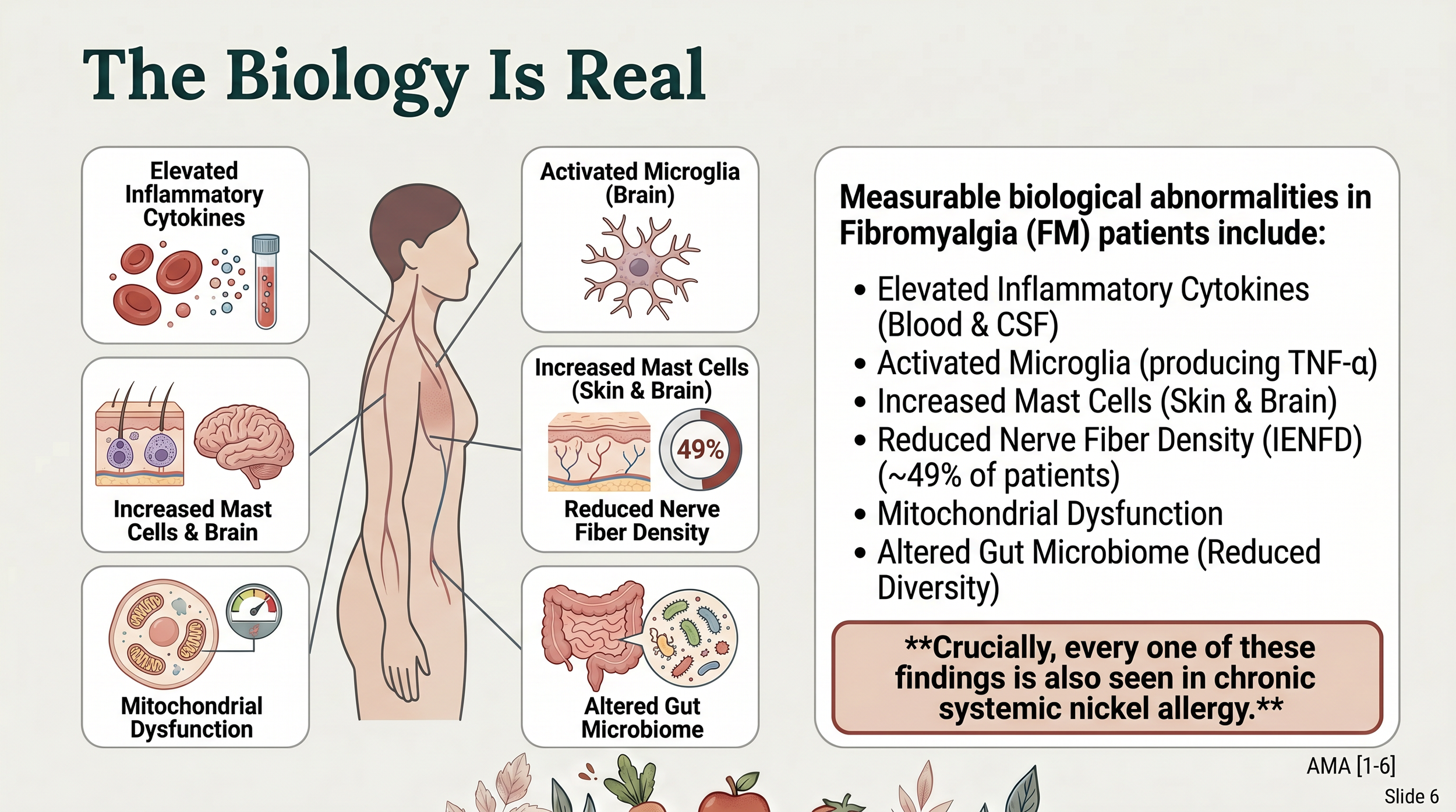 Fibromyalgia is a real biological disease with measurable findings — elevated inflammatory cytokines, activated microglia, proliferating mast cells, damaged small fiber nerves, disrupted gut bacteria, and failing mitochondria. And there is a growing body of evidence suggesting that systemic nickel allergy syndrome (SNAS) may be part of the picture for a meaningful subset of patients.