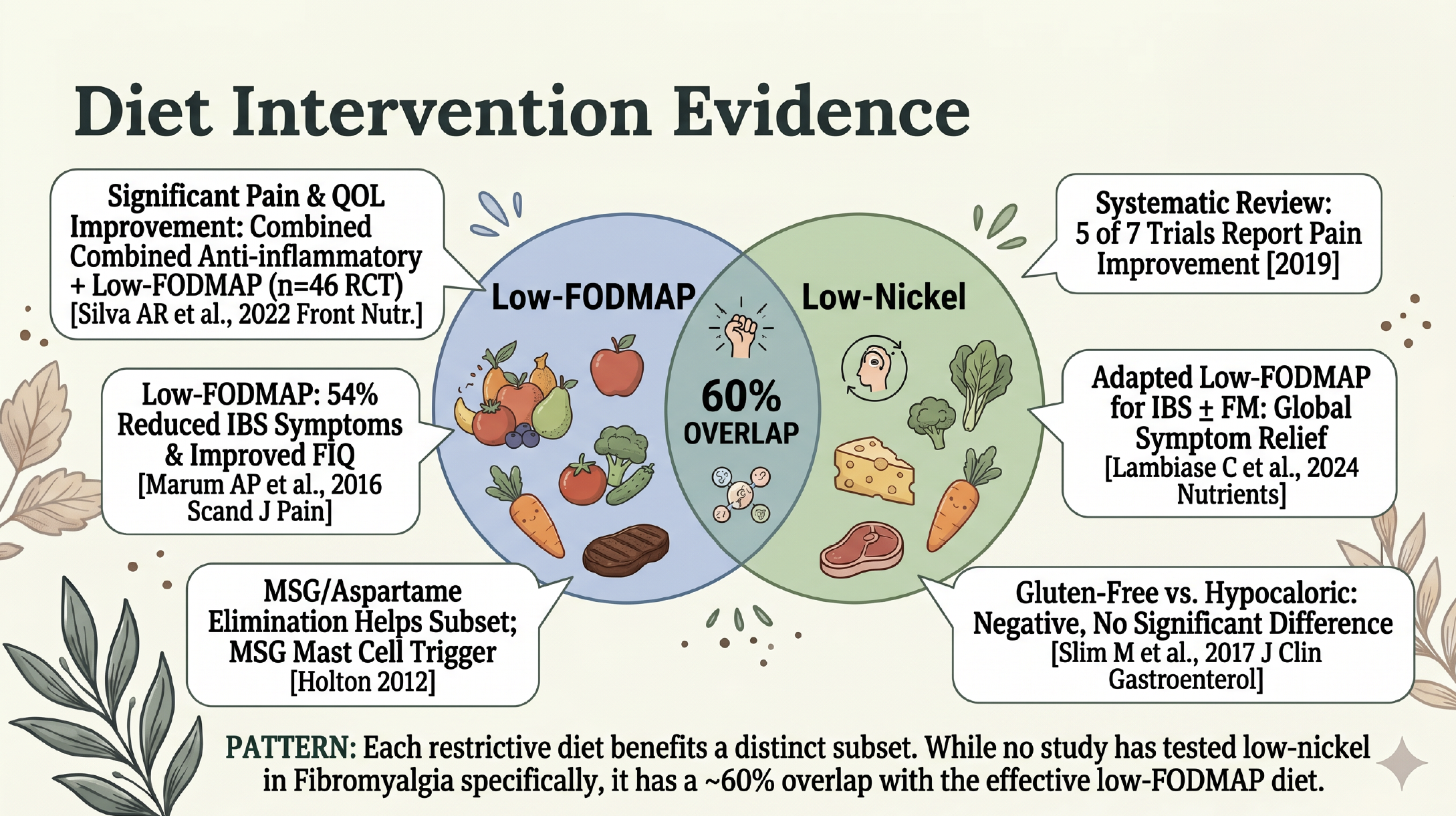 The pattern: every restrictive diet helps a subset. No study has tested low-nickel specifically in fibromyalgia. Low-FODMAP and low-nickel overlap approximately 60% — many “low-FODMAP responders” may be coincidentally lowering nickel intake.