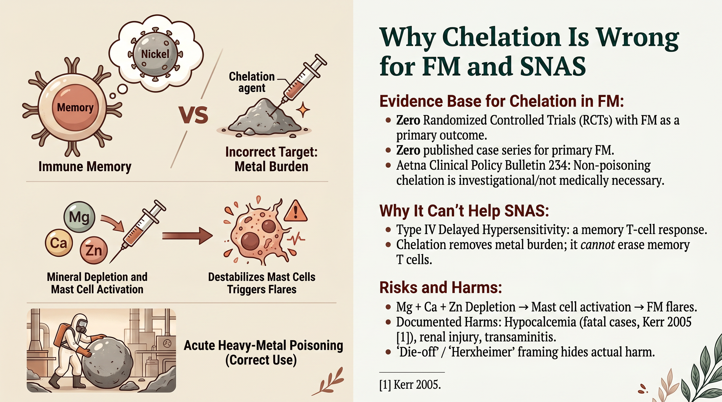 Why chelation cannot help SNAS: systemic nickel allergy is a Type IV delayed hypersensitivity — a memory T-cell response. The problem is immune memory, not metal burden. Chelation cannot erase memory T cells. And chelation agents deplete magnesium, calcium, and zinc — which destabilizes mast cells and can actively flare fibromyalgia and MCAS.