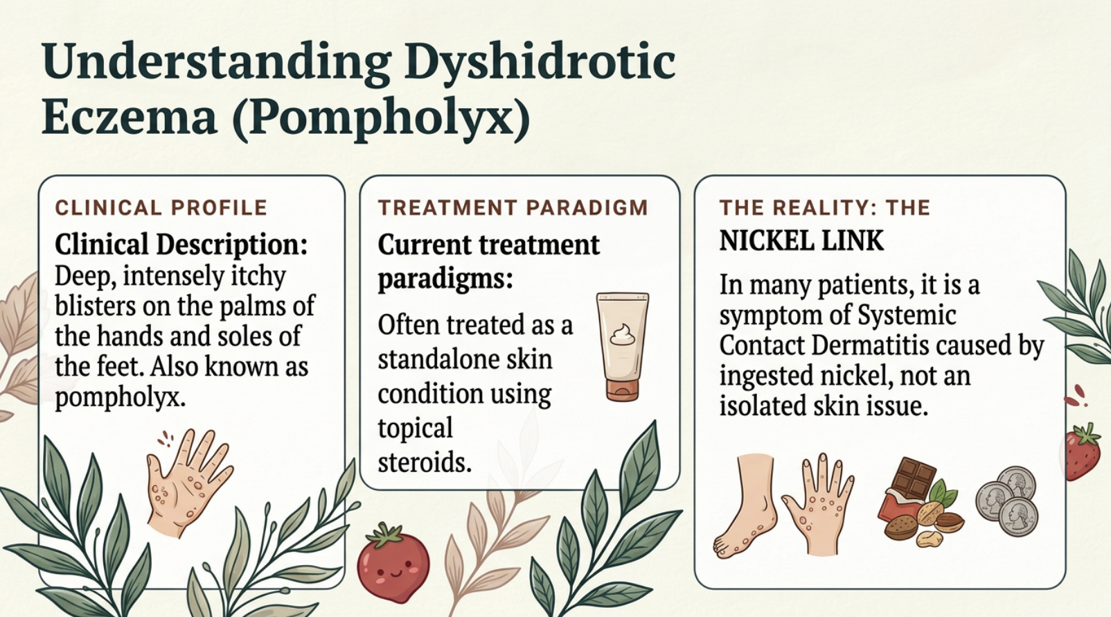 In many patients, dyshidrotic eczema is actually a manifestation of Systemic Contact Dermatitis — meaning the trigger isn't something touching your skin. It's something you're eating.