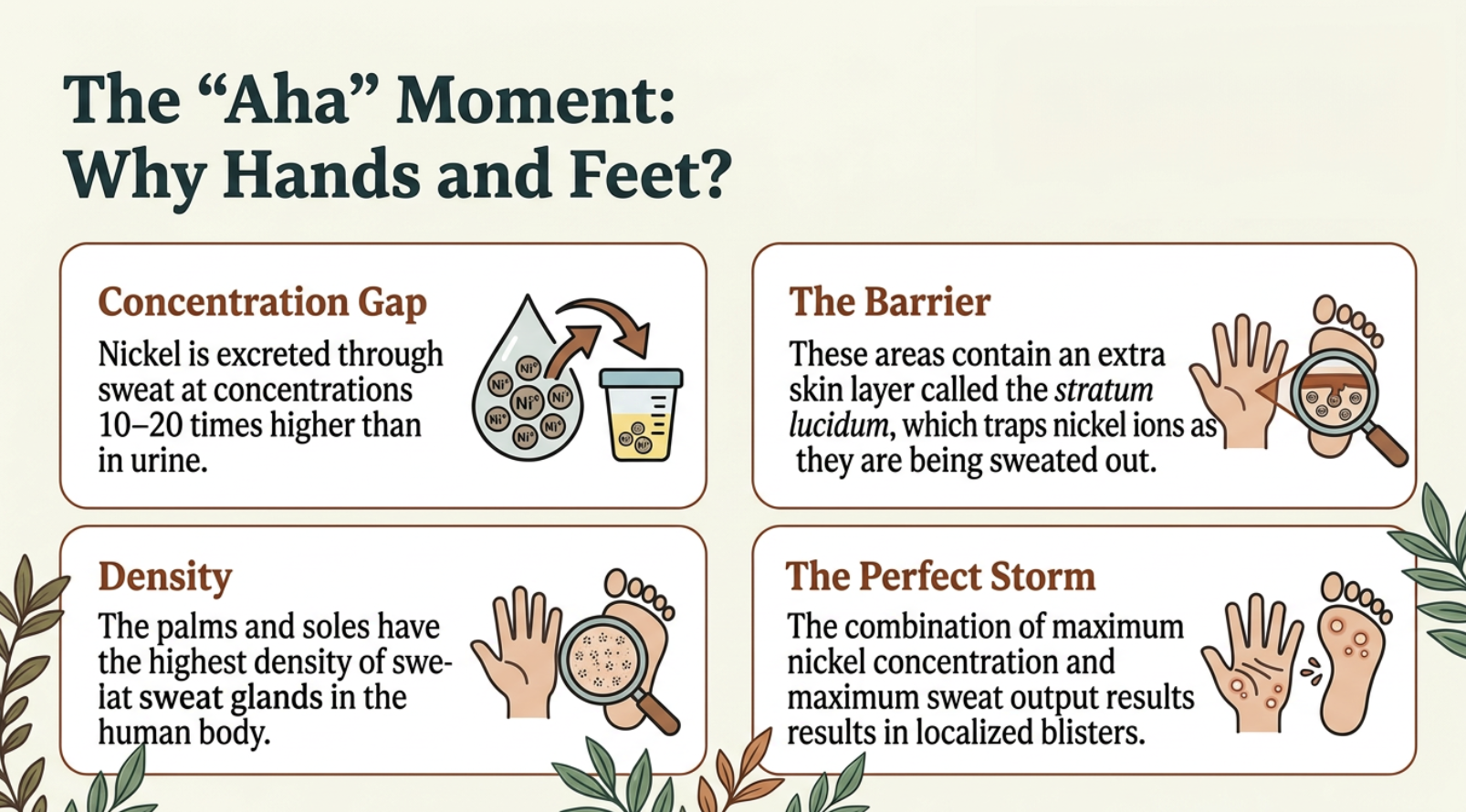 These areas also have an extra layer of skin called the stratum lucidum, which traps nickel ions as they're sweated out. Maximum nickel concentration plus maximum sweat output plus a skin layer that traps the metal — it creates a "perfect storm" for localized allergic blistering.