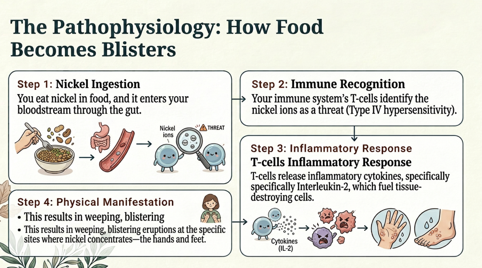 Here's the pathway: you eat nickel in food → it enters your bloodstream → your immune system's T-cells identify nickel as a threat → T-cells release inflammatory cytokines (like Interleukin-2) that fuel tissue-destroying cells → result: weeping, blistering eruptions.