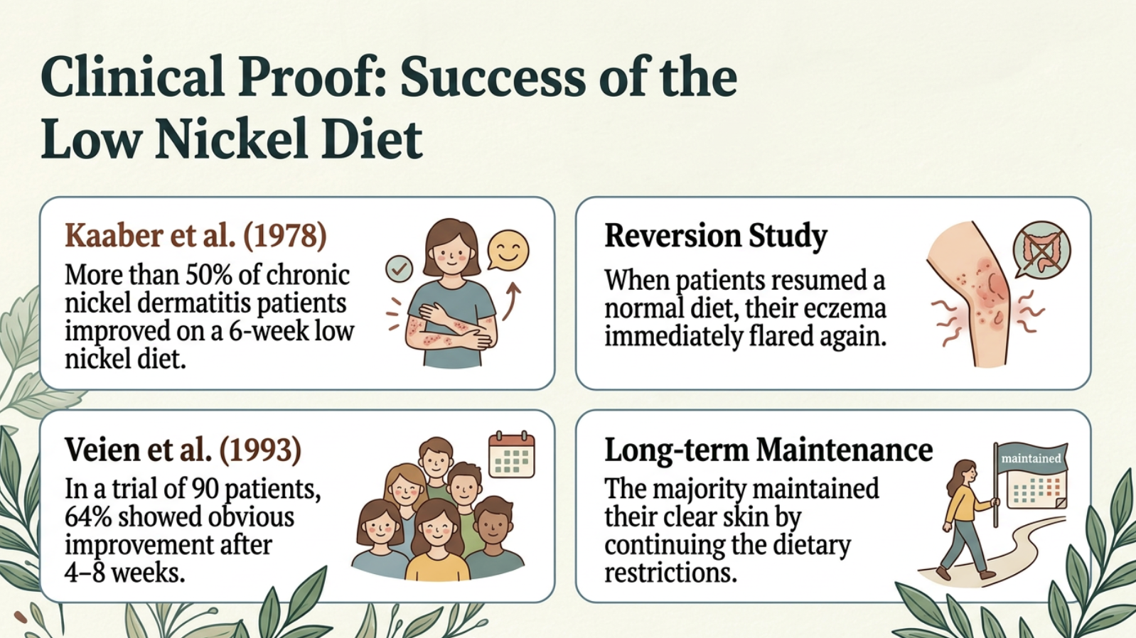 In a foundational study, over 50% of patients with chronic nickel dermatitis improved on a 6-week low nickel diet. When 7 of those patients resumed a normal diet, their hand eczema immediately flared (Kaaber et al., 1978).