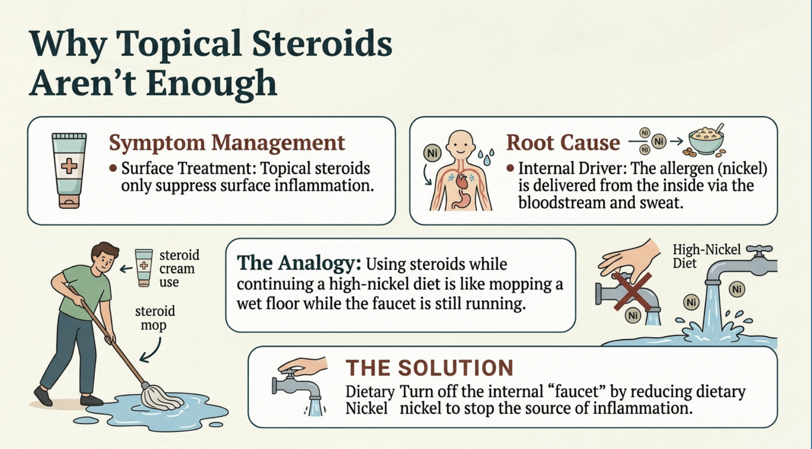 Imagine trying to mop a wet floor while the faucet is still on. That's what steroid cream does when dietary nickel is the driver. You have to turn off the faucet first — and the faucet is your diet.
