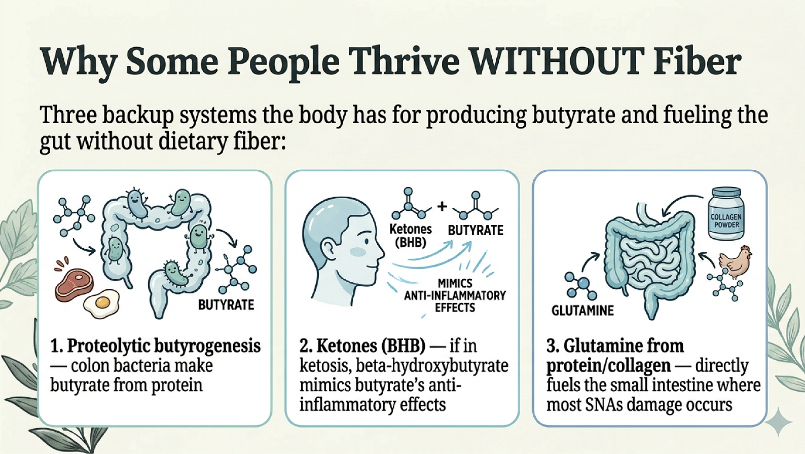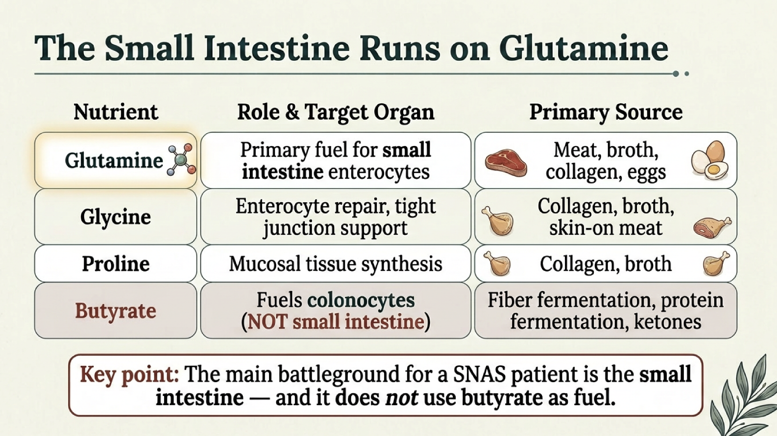 This means both neighborhoods need protection — but with different fuel. The small intestine needs glutamine (from meat, collagen, broth). The colon needs butyrate (from fiber fermentation, protein fermentation, or ketones).