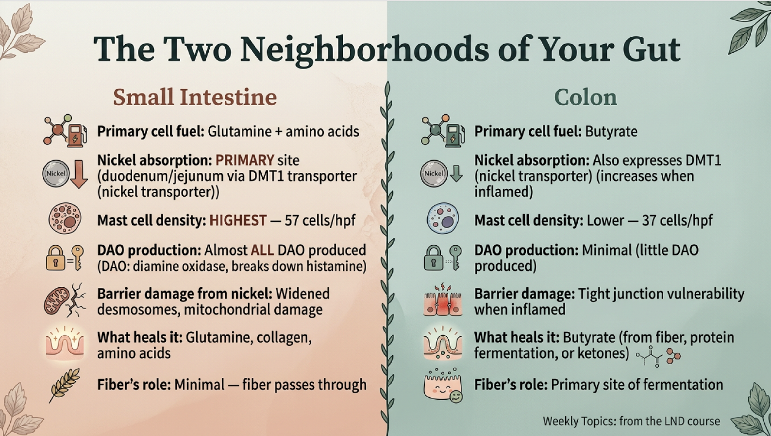 The small intestine is where most nickel is absorbed (via the DMT1 transporter in the duodenum and jejunum), where mast cell density is highest (57 cells per high-power field vs. 37 in the colon), and where almost all DAO — the enzyme that breaks down histamine — is produced. The small intestine runs on glutamine and amino acids, not butyrate.