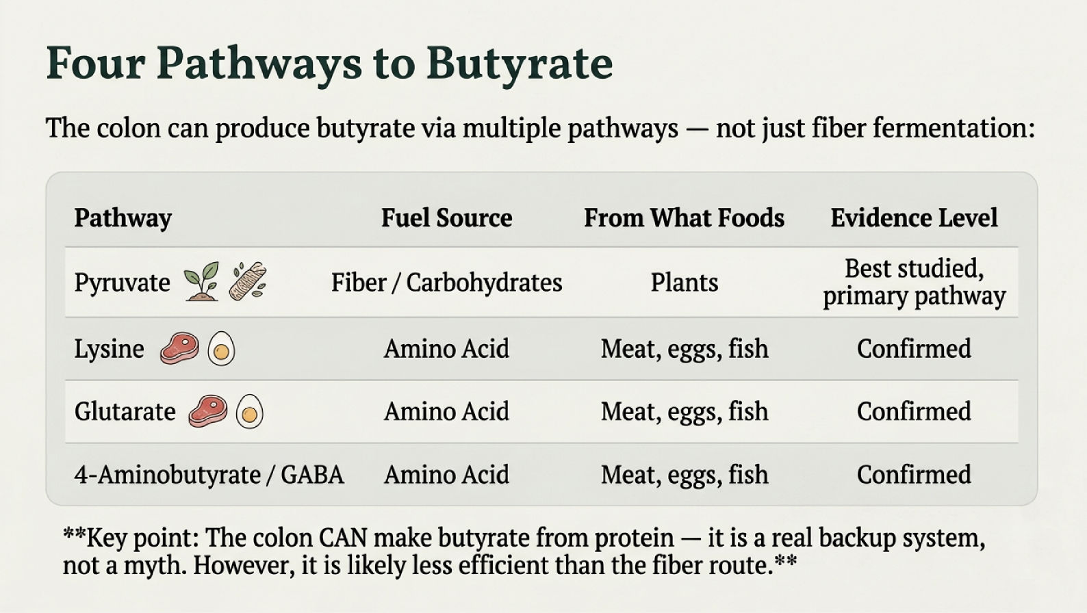 Proteolytic butyrogenesis: Your colon bacteria have four confirmed pathways to produce butyrate, and three of them use amino acids from protein — lysine, glutarate, and 4-aminobutyrate (Vital et al., 2014, mBio). This means a protein-rich diet does provide some colonic butyrate, though likely less efficiently than the fiber route.
