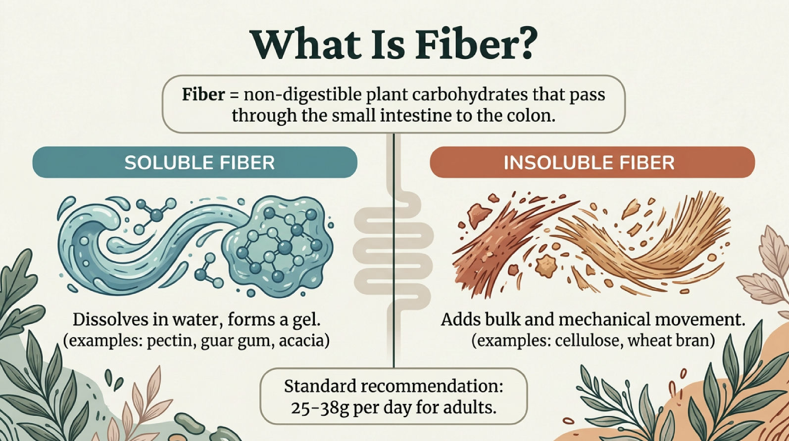 Fiber is a non-digestible plant carbohydrate that passes through the small intestine and arrives in the colon, where bacteria ferment it into short-chain fatty acids (SCFAs) — most importantly, butyrate.