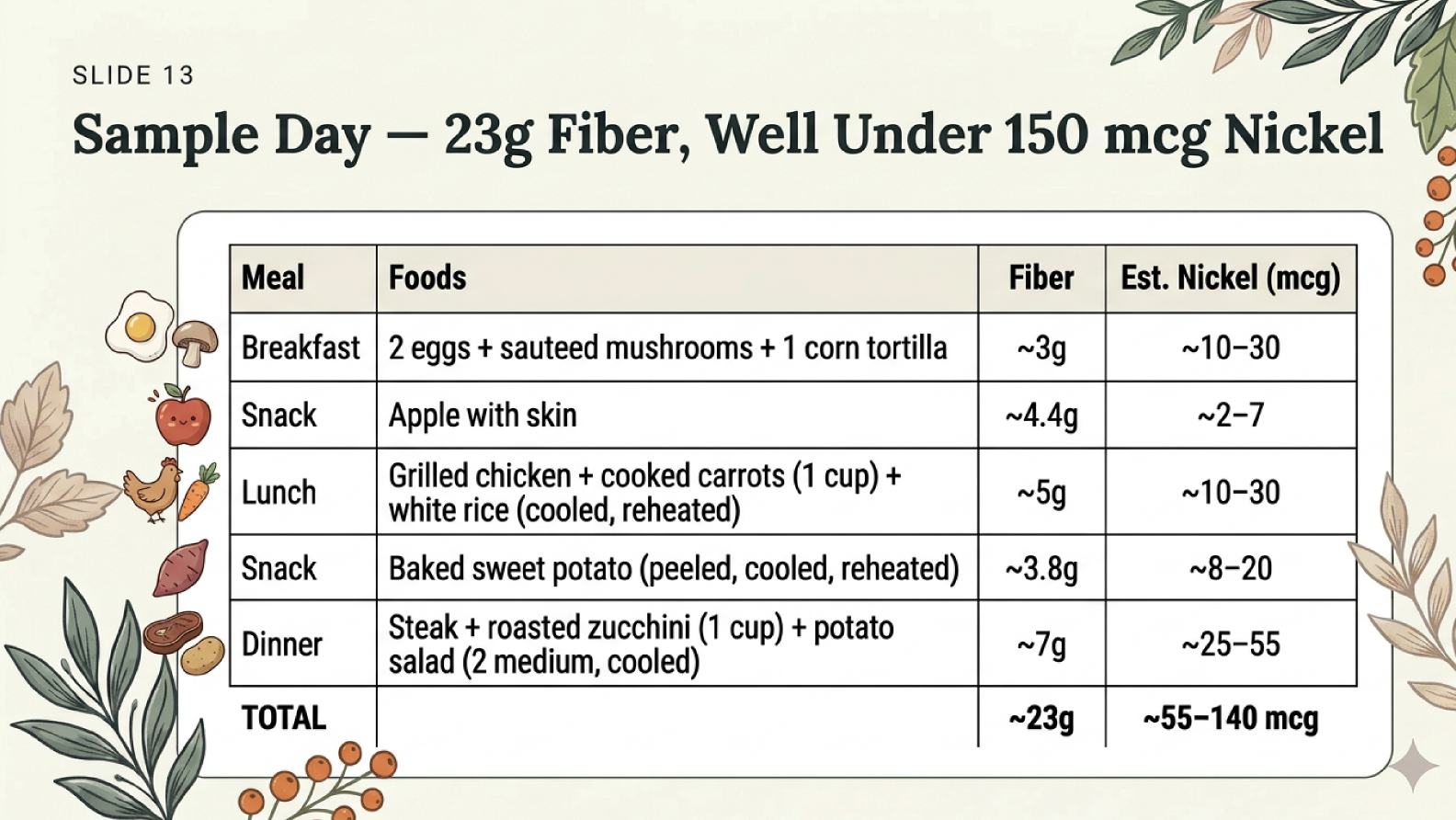 A full day using these foods can yield approximately 23 grams of fiber on an estimated 55–140 mcg of nickel — well within the daily target.