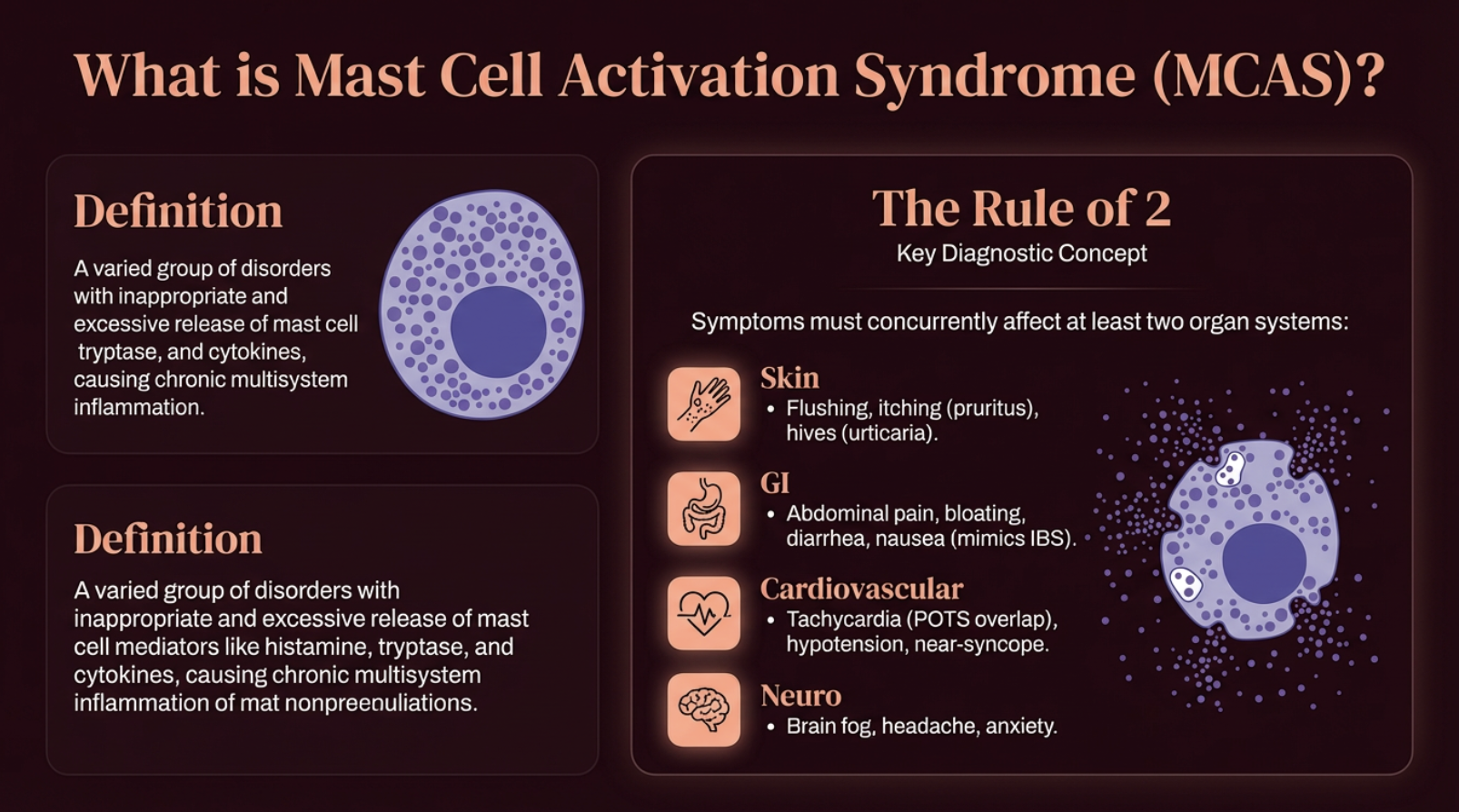 **Mast Cell Activation Syndrome (MCAS)** is characterized by the inappropriate and excessive release of mast cell mediators — histamine, tryptase, leukotrienes, and cytokines — causing chronic inflammation across multiple organ systems. To meet diagnostic criteria, symptoms must affect at least two organ systems concurrently: skin (flushing, itching, hives), GI (bloating, pain, diarrhea), cardiovascular (tachycardia, POTS overlap), and neurological (brain fog, headache, anxiety) (Weiler et al., 2019; Valent et al., 2019).