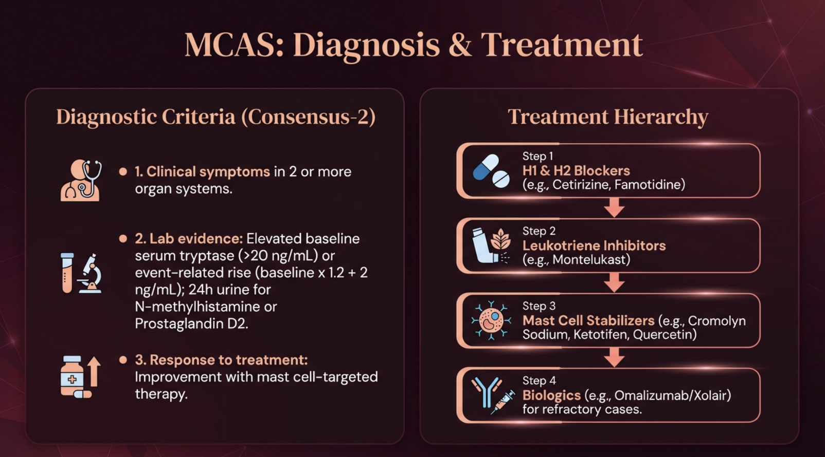 **MCAS** symptoms are triggered by many factors — stress, heat, vibration, smells, and a wide range of foods. Reactions are often immediate or anaphylactoid. Diagnosed by lab evidence (elevated tryptase, urinary histamine metabolites) plus response to mast cell-targeted therapy.