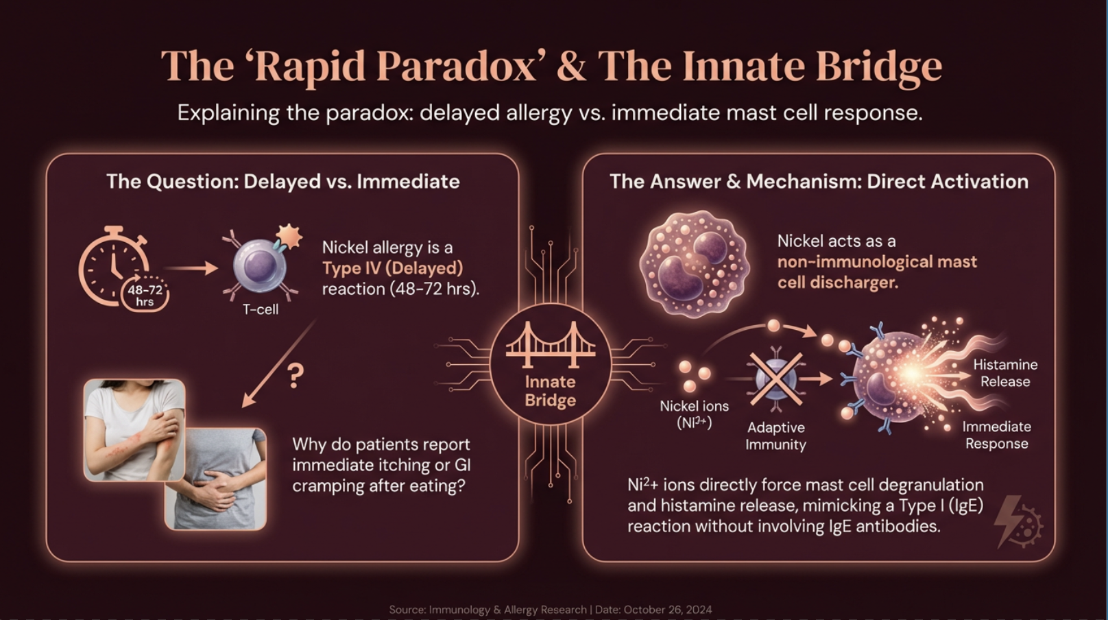 Nickel allergy is classified as a Type IV delayed hypersensitivity — meaning reactions should take 48 to 72 hours. So why do patients report immediate itching, flushing, or GI cramping after eating high-nickel foods?