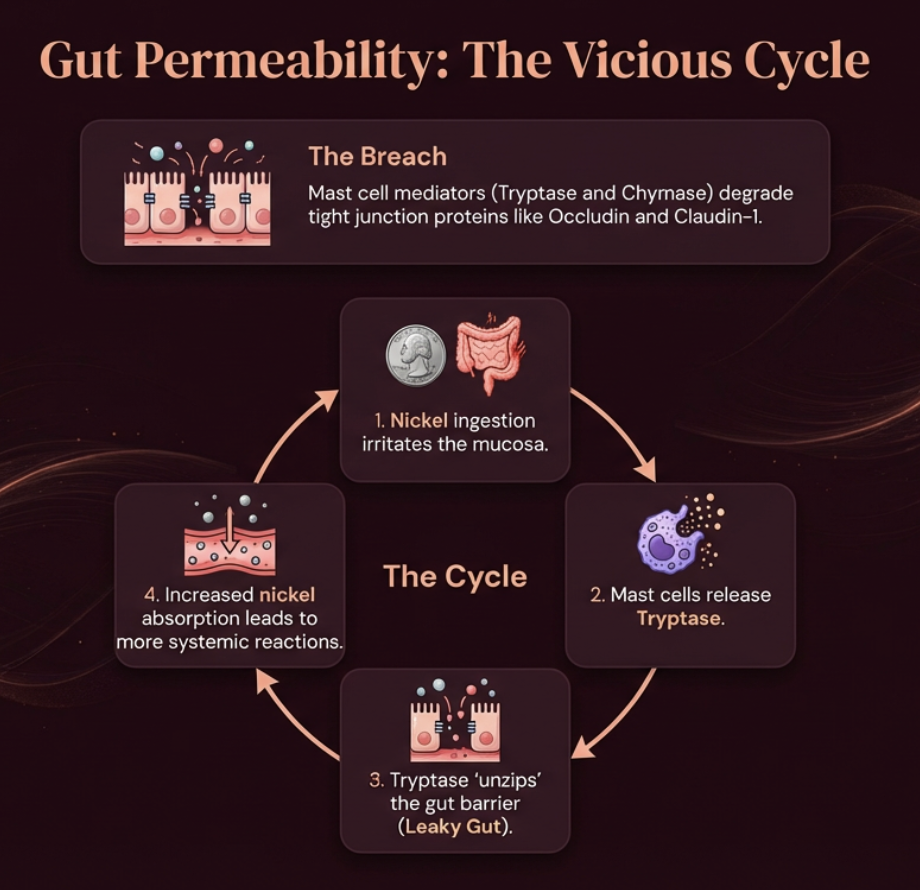 This creates a vicious cycle: nickel ingestion irritates the mucosa → mast cells release tryptase → tryptase "unzips" the gut barrier → more nickel enters the bloodstream → more systemic reactions → more mast cell activation. Each cycle makes the next one worse.