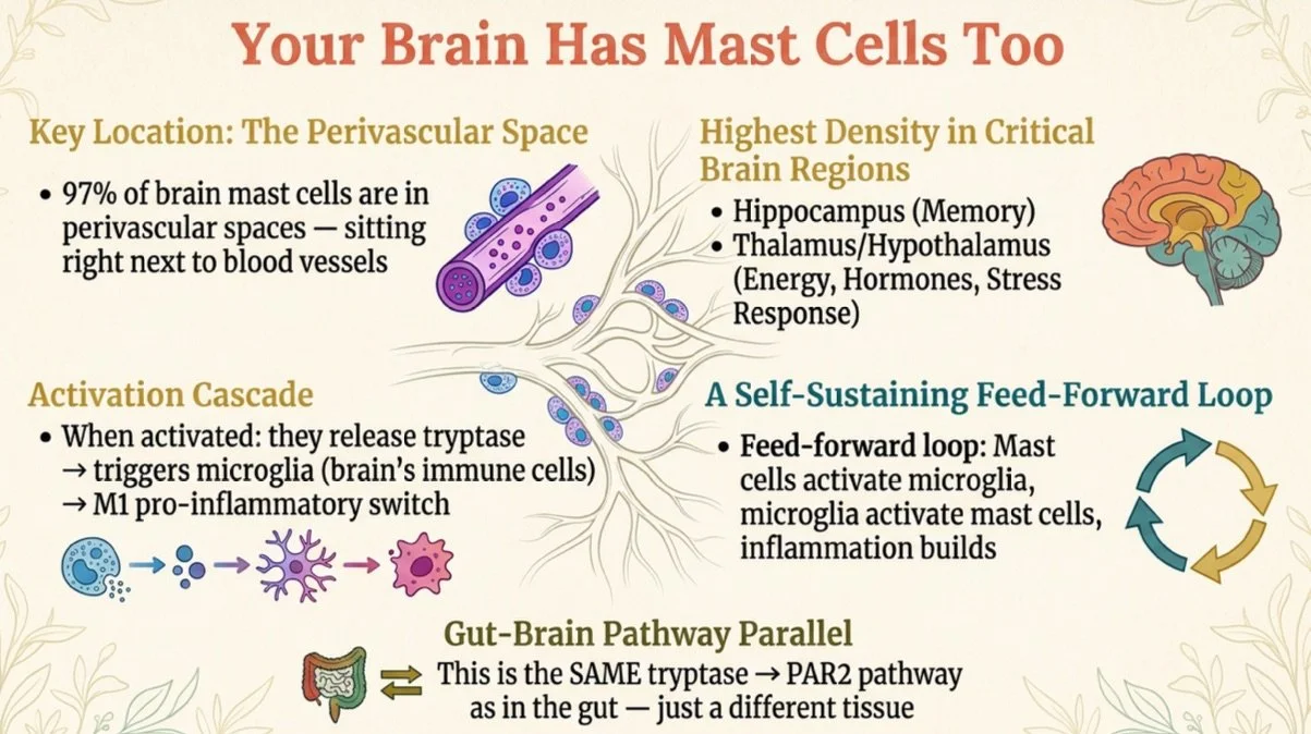 You probably associate mast cells with skin reactions or gut symptoms. But your brain has its own population of resident mast cells, and approximately 97% of them sit in perivascular spaces — right next to blood vessels, astrocytes, and microglia (Dong et al., 2014; PMID: 25436584).