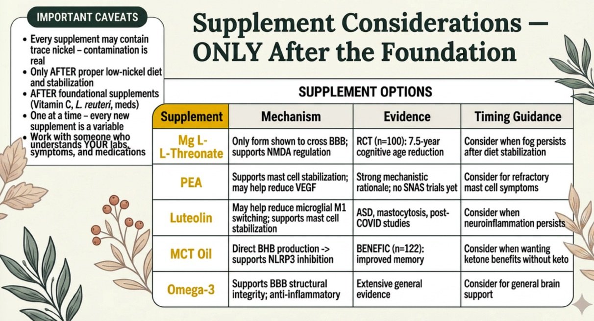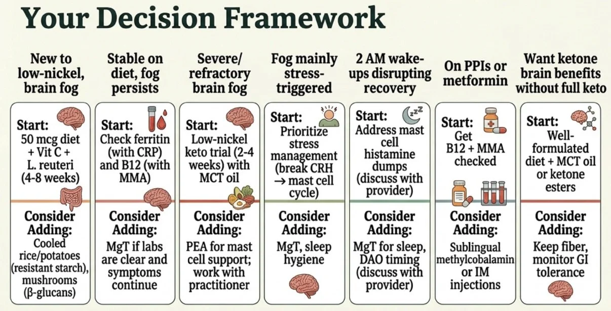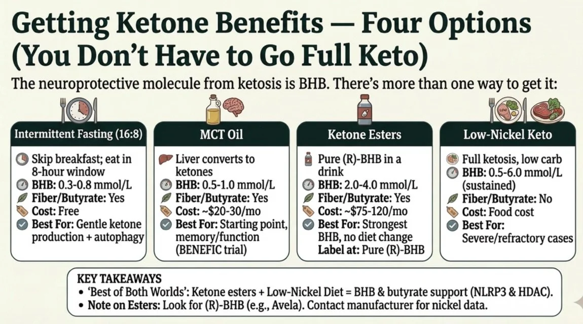 For severe or refractory brain fog, a low-nickel ketogenic approach or exogenous ketone supplementation may provide additional support. BHB directly inhibits the NLRP3 inflammasome and activates GPR109A on microglia (where it is actually stronger than butyrate). The BENEFIC trial (n=122) showed improved memory and a 230 percent increase in brain ketone uptake with 30g/day MCT oil over six months (Fortier et al., 2021; PMID: 33103819).