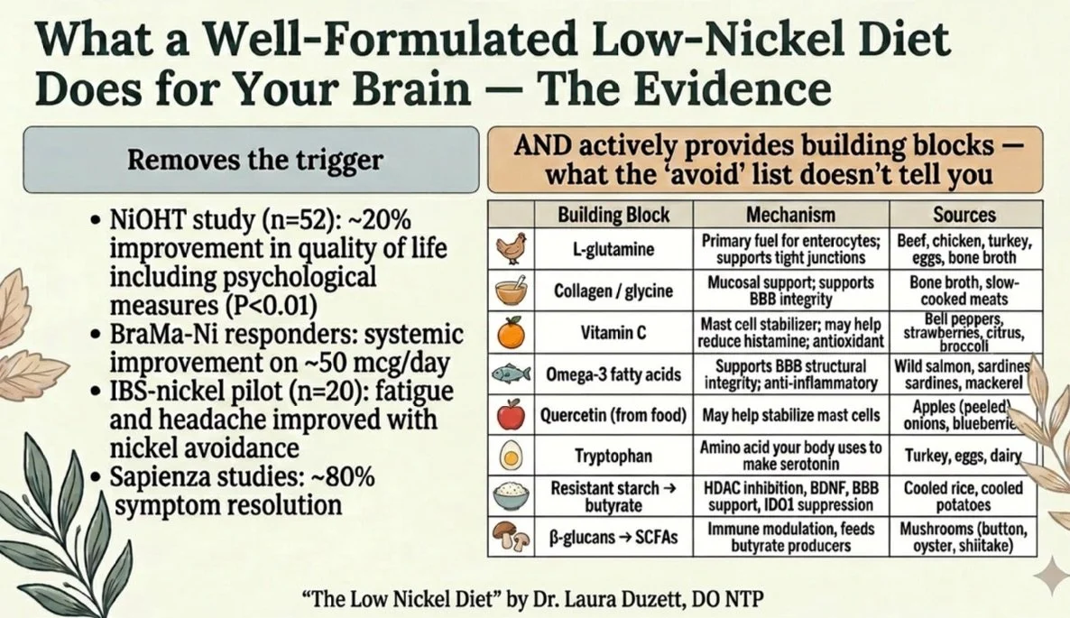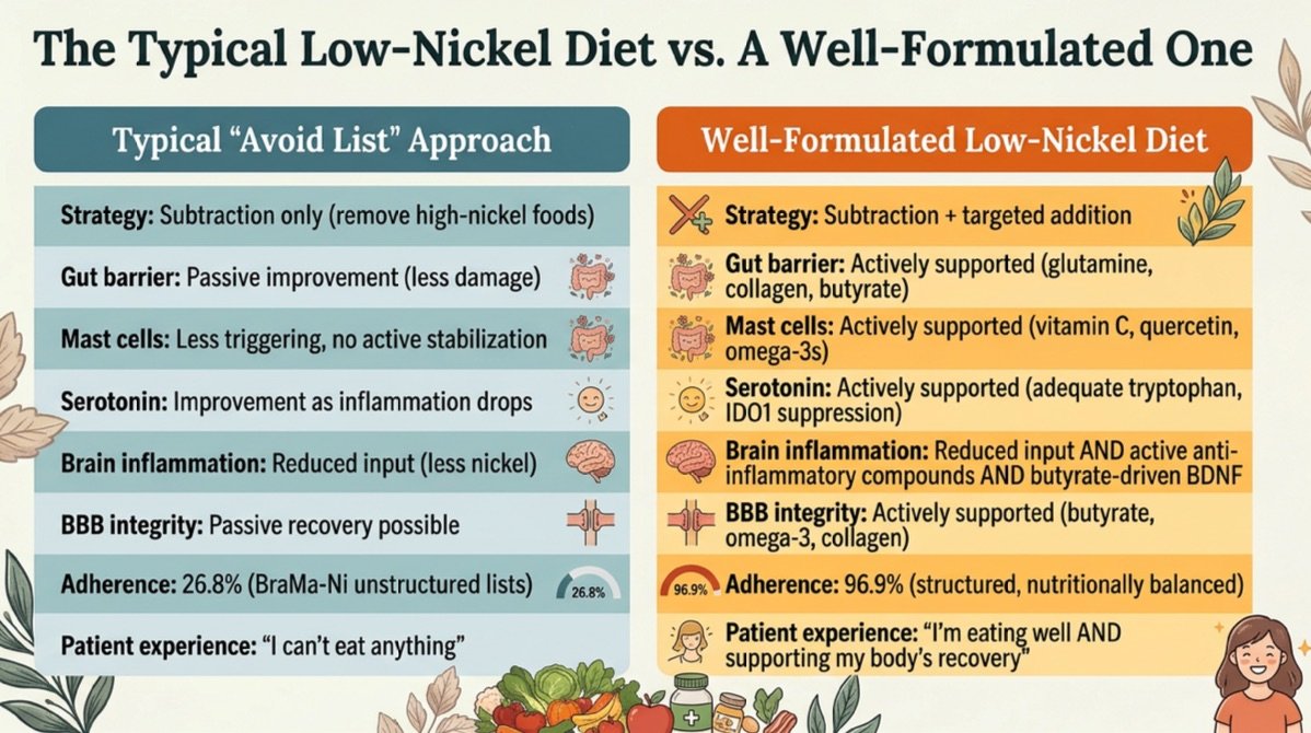 When you reduce nickel intake to approximately 50 mcg/day, the plate naturally shifts toward animal proteins. This shift provides building blocks your brain needs: L-glutamine for gut barrier integrity, tryptophan for serotonin production, omega-3 fatty acids for BBB structural support, and vitamin C as a mast cell stabilizer. The Low Nickel Diet cookbook makes this practical.