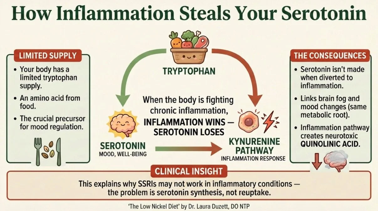 This is why brain fog and mood changes so often go together in SNAS. They share the same metabolic root. It is also why SSRIs may not fully address mood symptoms in inflammatory conditions — the problem is not always reuptake. Sometimes the problem is that serotonin simply is not being produced in adequate amounts.