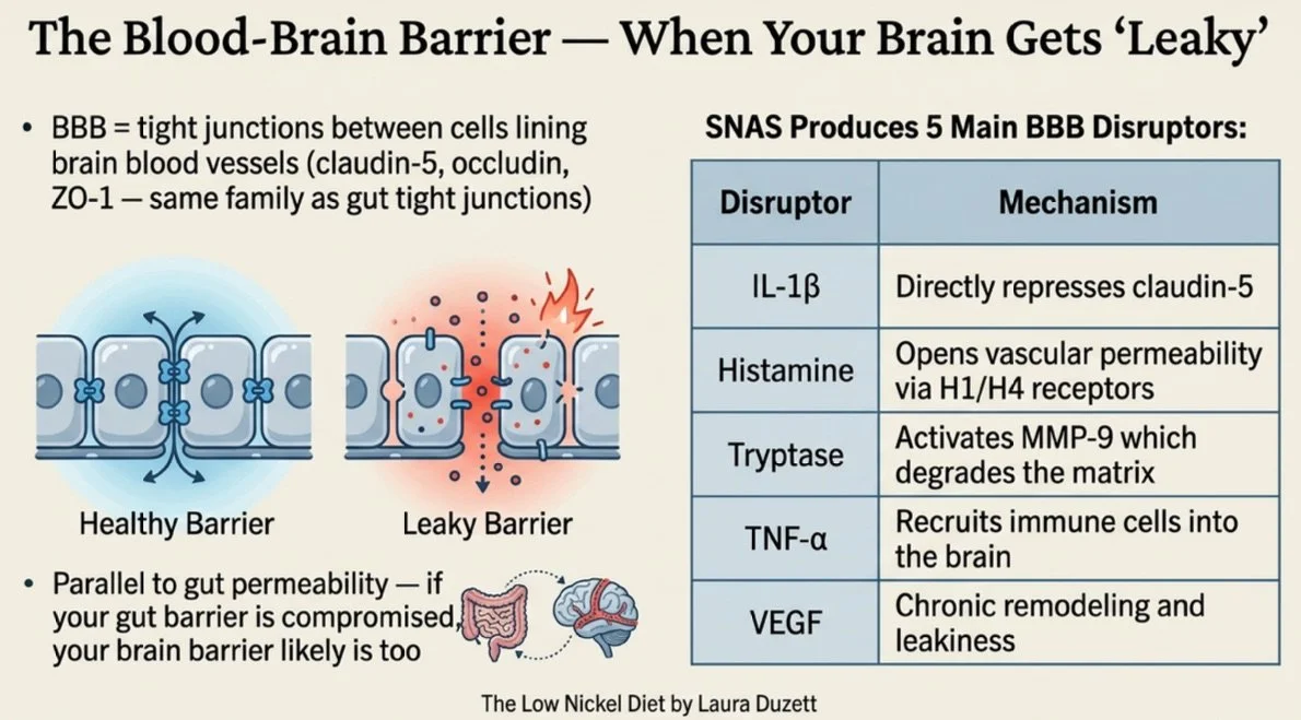 The blood-brain barrier (BBB) is made of tight junction proteins — claudin-5, occludin, and ZO-1 — that keep harmful molecules out of your brain tissue. SNAS produces at least five mediators that compromise these junctions (Galea, 2021; PMID: 34497379):