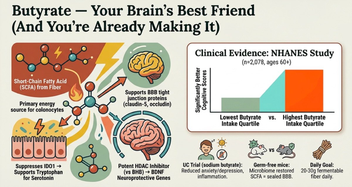 Population-level data backs this up: in the NHANES cohort (n=2,078, ages 60+), the highest butyrate intake quartile showed significantly better cognitive scores. And in a 12-week RCT (n=36), 600 mg/day of sodium butyrate reduced both anxiety/depression scores and inflammatory markers.